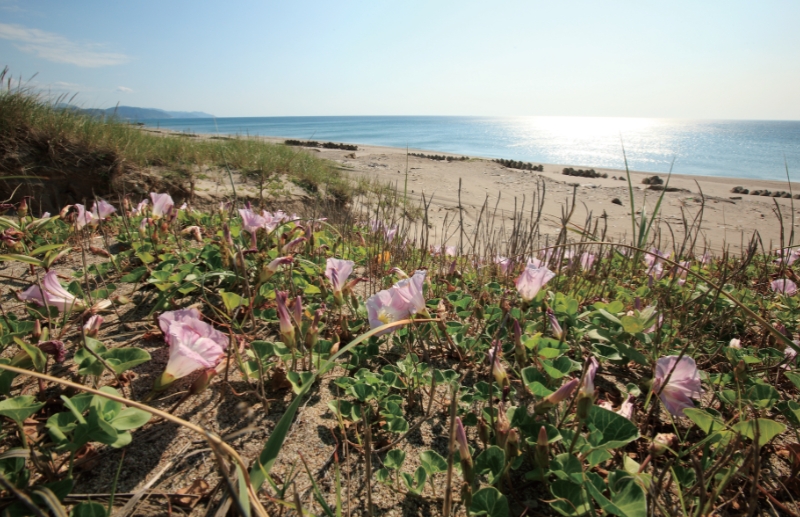 庄内砂丘に咲いていたハマヒルガオ。茎が砂の上を這い群生する。空港近くの海岸線道路の両脇にはクロマツに防砂林が続く。