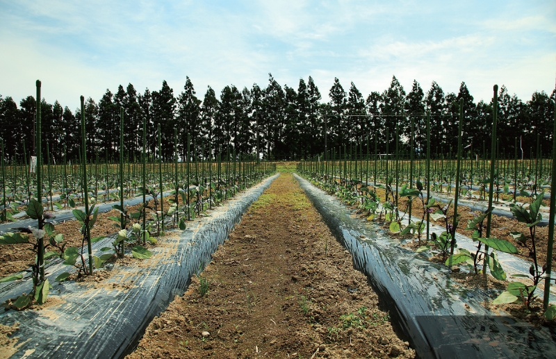 鶴岡の民田なす畑。奥に見える道路の向こう側が「民田」で、畑があるのは「高坂」。地名の通り、民田より少し高くなっている高坂の方が、なすの実りがいい。