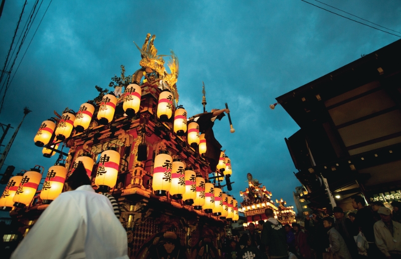 町中を舞台に、豪華絢爛たる12台の屋台が曳きそろえられ、宮廷絵巻さながらの情景を描き出す。お旅所前の広場では、三番叟、龍神台、石橋台によるからくり奉納。人形たちがしなやかに舞い、早変わりやキレのある動作を繰り出す。