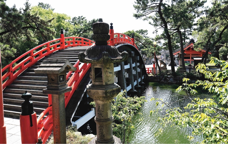 渡るだけでお祓いになるという反橋(そりはし)。石造橋脚は豊臣秀吉の妻、淀君が秀頼の成長祈願に奉納したと伝えられる。