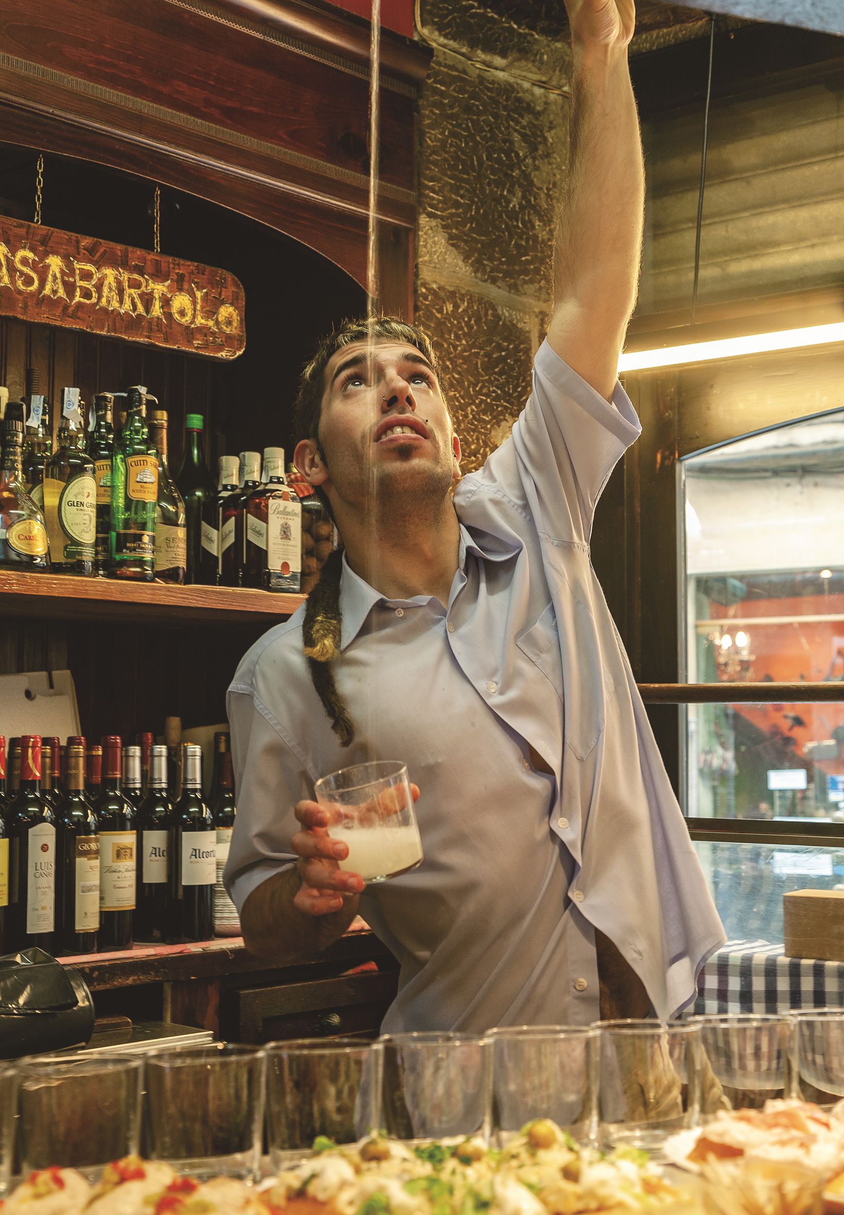 カウンターにズラリと並んだピンチョスは実に壮観で、客が好みで選べるようなスタイルにしたのもサンセバスティアンのバルが発祥だ 。バルに不慣れな観光客にとっても便利なシステムと言え、バルのハシゴを楽しくしている 。