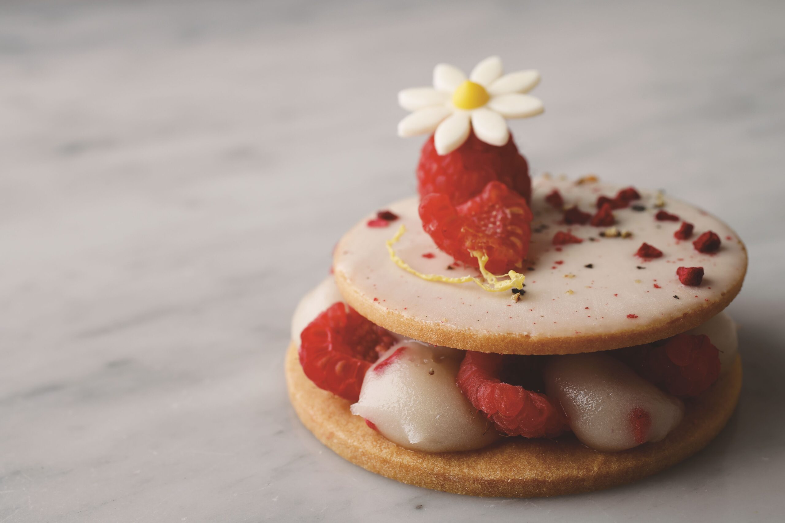 まずは、フランボワーズと白あんの「アン・ルージュ」。こちらは白あんの繊細な甘みに、ストレートにフランボワーズの甘酸っぱさをぶつけている。バターをふんだんに使ったガレット生地に、刻んだフランボワーズを混ぜ込んだ白あんを絞り出し、フランボワーズと交互に配置する。さらにホワイトチョコレートを薄くコーティングしたもう一枚のガレットを重ね、刻んだフランボワーズを散らして仕上げている。「フランボワーズを選んだのは、酸味も甘みも濃いからです。生クリームやカスタードにはいちごで十分ですが、白あんの甘みとなると、フランボワーズくらいの凝縮された酸と甘みが必要になってくるのです」と森氏。実際に試食すると、確かに両者が違和感なくなじんでいるのがよく分かる。バターとの相性の良さは、近年のあんバター人気ですでに証明済みだが、ふんだんにバターを使ったガレット生地とのなじみも実に良い。