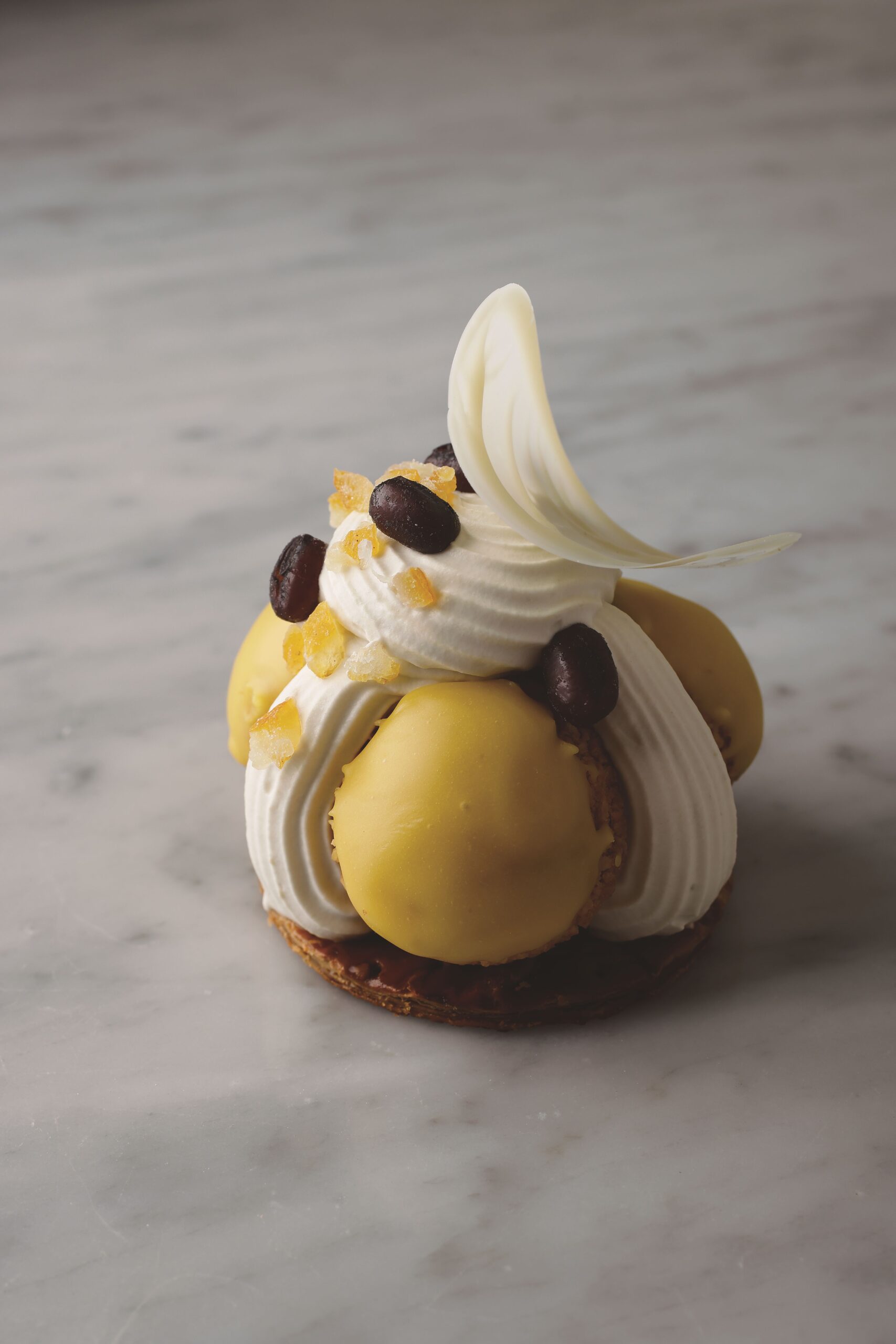 もう一品の「カルム」は、こしあんと柚子、ほうじ茶クリームのサントノーレ。パイ生地の上にシューをのせて、クリームを絞り出す、古典のフランス菓子のアレンジだ。さくさくのパイ生地の上にのったシューの中には、柚子のペーストがたっぷり詰められ、三つのシューの中心部に、接着の役目も果たす、こしあんを潜ませている。さらに上には、ほうじ茶の風味をきかせた香ばしい生クリームがふんわりと絞り出してある。味の構造的には、こしあんのしっかりした甘みを柚子の酸味で切り、ほうじ茶風味의軽い生クリームと組み合わせて、涼やかな余韻を持たせようというもの。三つの和の要素が見事なハーモニーを織りなし、森氏の狙いは成功したと言えよう。「あんは、生クリームのような油脂分ともとても相性が良いんです。果物ともそうですが、そういう意味で実はとても守備範囲が広い素材です。それを今回のテーマで改めて実感できたことはとても収穫でした。とはいえ、今後、自分の店で扱うかというと、それは別問題。あんは大切にとっておきたいと思っています」と森氏は言う。