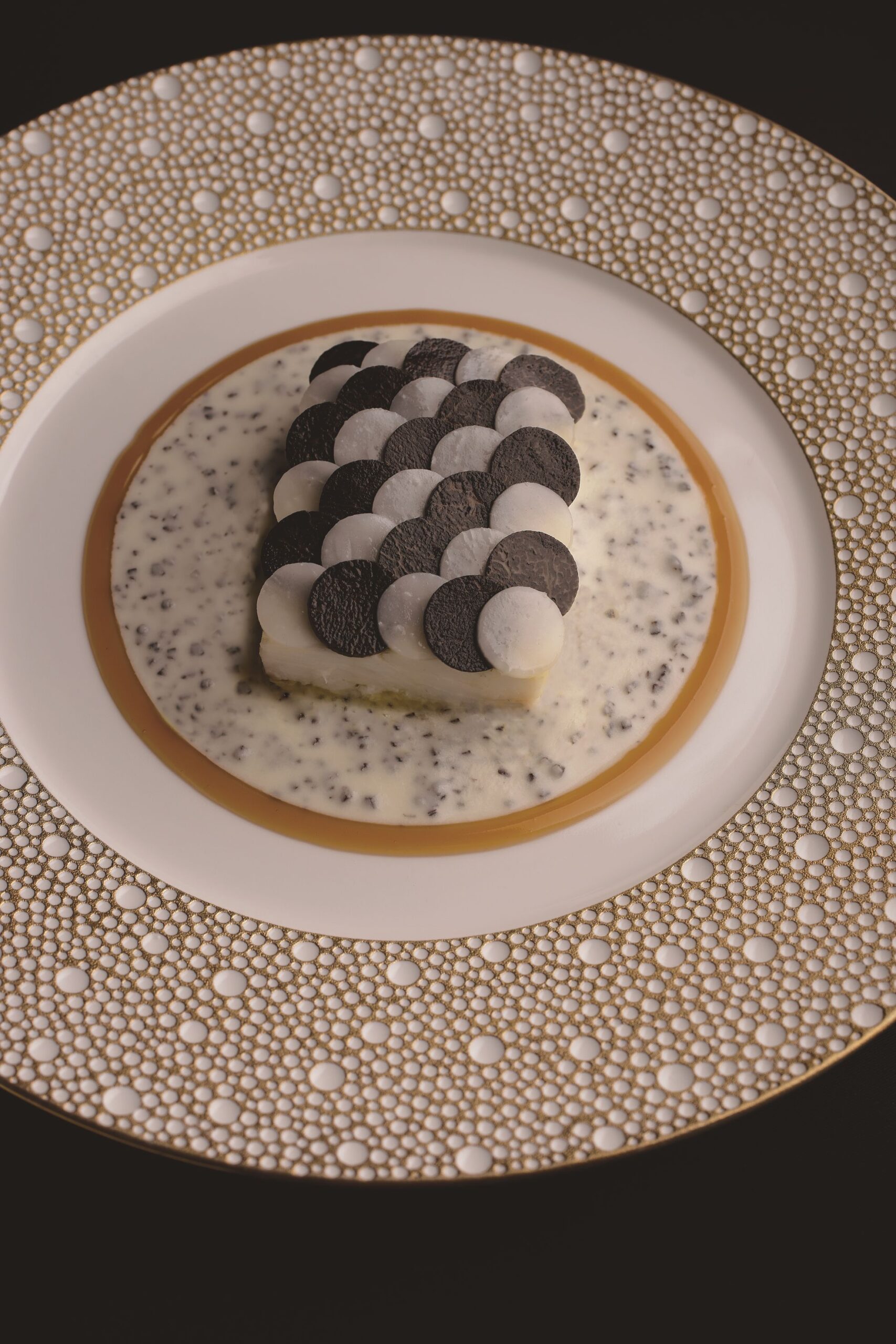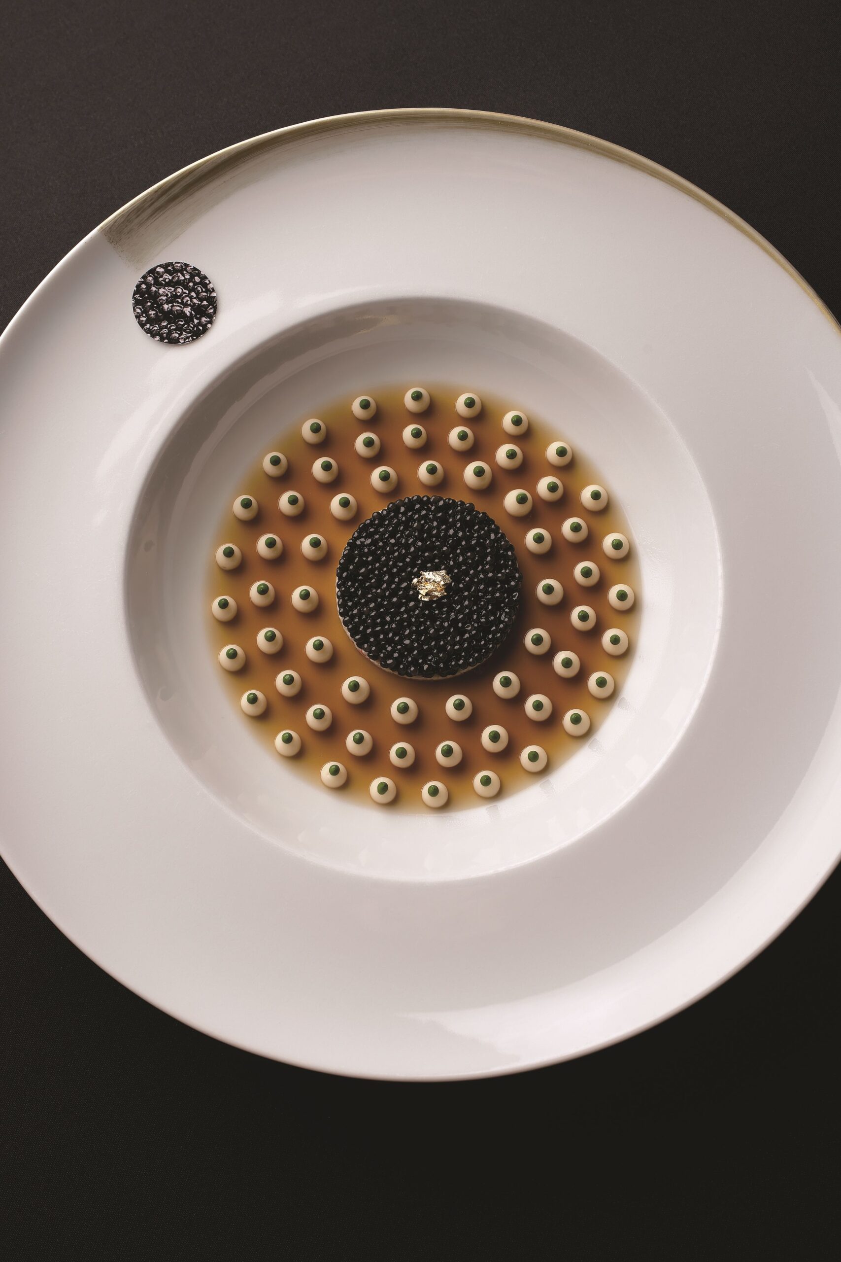 さて、今回の料理は、言わずと知れた、ロブション氏のスペシャリテ。一皿目の「キャビア アンペリアル ロブションスタイル」は、蟹、キャビア、カリフラワーのクレーム、甲殻類のジュレという、美味ここに極まれりという組み合わせだ。二皿目は「しっとりと蒸し上げた平目 黒トリュフと平目のダミエ仕立て」。ダミエとはチェッカーボードの意味。旨みの強い肉厚の平目を蒸し上げ、冬が旬の平目と黒トリュフを重ねたものだ。いずれも最小限の素材数で深淵な宇宙のような味世界を構成しているのがよくわかる。