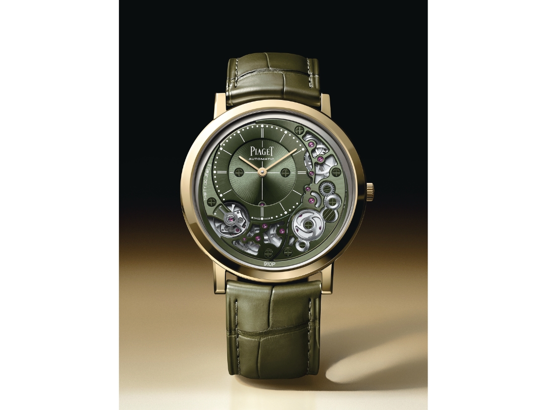 その新作「アルティプラノアルティメートオートマティック」には、薄型ウォッチメイキングの伝統と、ジュエラーとしての匠の技が、二つながら息づいている。ケースバック自体がメインプレートを兼ねたムーブメントを、厚さわずか4.3㎜のYGケースに搭載。文字盤とブリッジは深みのあるカーキグリーンに彩られ、ゴールドとの絶妙のハーモニーを奏でている。ムーブメント外周部のペリフェラルローターはスレートグレーとグリーンのツートーンに、さらに文字盤と色調をそろえたアリゲーターストラップをセットし、細部に至るまで完璧が期されている。