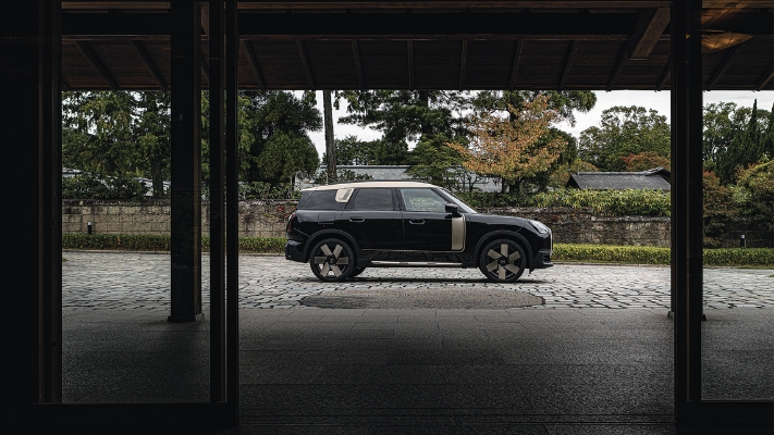 伊豆長岡温泉に位置する三養荘の本館は、1929年に岩崎弥太郎の長男である久彌の別邸として建てられたものだ。瀟洒な数寄屋造りの和風建築は、2017年に有形文化財に登録されている。この歴史ある木造建築物の前にMINIカントリーマンを止めると、日本の伝統美と最新のSUVスタイルが鮮やかな対比を見せた。木や瓦といった温かみのある素材と、LEDライトのクールな光が好対照だ。