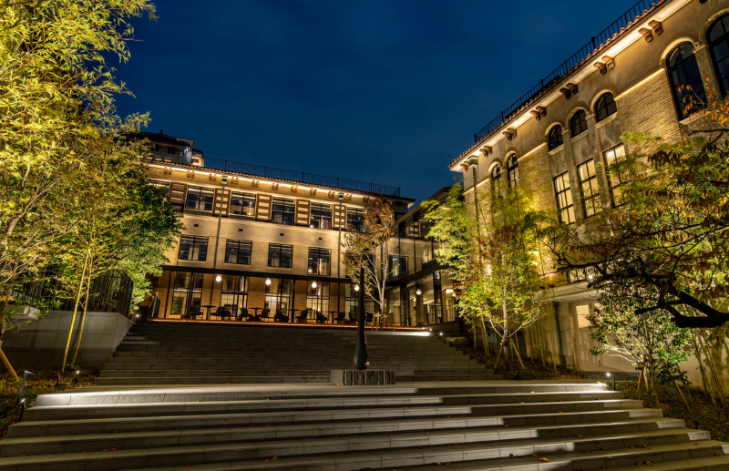 東山山麓の傾斜地に広がる緑豊かな約7000㎡の敷地に、3棟の校舎がコの字型に配置され、大階段が舞台のように設けられた造りも昔のままだ。中央棟に続く大階段の最上部は、東山の展望が楽しめるテラスとなり、その奥のかつての講堂は図書館風のレストランに。1000冊以上の文化書籍が並ぶ本棚に囲まれ、地元の旬の食材が並ぶ朝食や、夜にはカジュアルな寿司バーが好評だ。