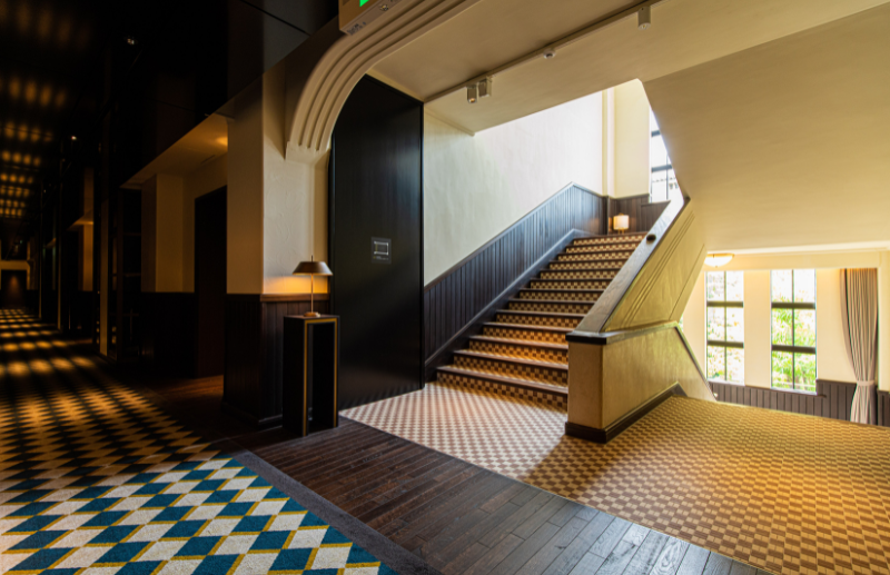 ほろ酔い加減で客室まで、壁沿いに飾られたいくつものかわいらしいアートオブジェを愛でながら、旧校舎の長い廊下を歩く。山林のようなアロマが漂う廊下の先まで敷かれた、龍の鱗と市松模様をモチーフにした絨毯の上をゆっくりゆっくりと……まるで、龍の背に乗って時空をさかのぼっているかのように。